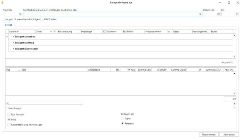 Über „Anlage einfügen“ kann in den Beleg aus einem anderen Beleg wie z.B. Lieferschein oder Rechnung Informationen übernommen werden.