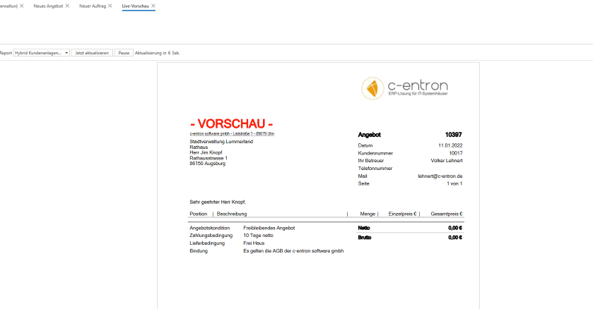 Über die Live-Vorschau kann der Beleg so angezeigt werden, wie er aussehen würde, wenn man ihn jetzt ausdrucken oder vermailen würde.
