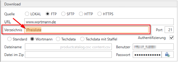 Beim FTP Server war das Unterverzeichnis „/Preisliste“ (bei Wortmann) nicht angegeben, somit konnte die angegebene Datei nicht gefunden, also auch nicht heruntergeladen werden.