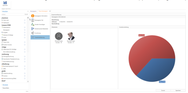 In der Zusammenfassung ist ein Überblick der Kampagne zu sehen und das [Speichern] möglich. Das [Speichern] ist jederzeit während des Erfassens der Kampagne unter Zusammenfassung möglich.