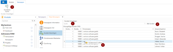 Um der Kampagne eine Kundenliste hinzuzufügen, kann auf den Bereich Suche (1), Gespeicherte Suche (2) oder in die Erweiterte Suche (3) geklickt werden und dort die Datensätze für die Kampagne ausgesucht werden.