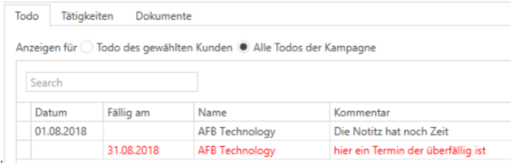Im Reiter „Todo“ sind je nach Auswahl über die komplette Kampagne oder nur den ausgewählten Kunden, nicht spezifisch für den aktuell angemeldeten Mitarbeiter, die einzelnen Todo einzusehen.