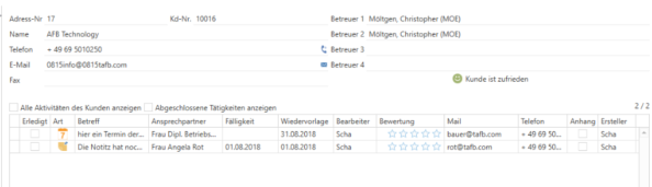 Die Übersicht im Reiter „Tätigkeiten“ verändert sich je nach Auswahl. Ist ein Kunde ausgewählt sind die Kundeninformationen und alle Aktivitäten des Kunden zu sehen, ist ein Ansprechpartner ausgewählt sind die Ansprechpartnerinformationen und die Aktivitäten des Ansprechpartners zu sehen. Die Aktivitäten sind standardmäßig auf die aktuelle Kampagne gefiltert, es gibt aber die Möglichkeit hier alle Tätigkeiten anzeigen zu lassen.