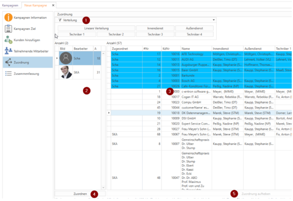 Dies kann über die Buttons der Verteilung (1) geschehen, wodurch die Kunden an ihre entsprechenden Betreuer verteilt werden. Oder der linearen Verteilung, die alle nicht verteilten Kunden gleichmäßig auf alle Mitarbeiter verteilt. Da dies alle Kunden ereilt sollte dies Funktion optimaler Weise als letzte Verteilung genutzt werden, da danach keine automatische Verteilung mehr möglich ist.