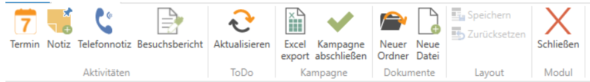 Ist ein Kunde ausgewählt, werden Aktivitäten für den Standardansprechpartner angelegt. Ist ein Ansprechpartner ausgewählt, wird die Aktivität auf diesen angelegt. Der Button [Aktualisieren] ist nur für die Kampagnen eigene Todo-Liste. [Excel Export] erstellt ein der Delphi ähnliches .xlsx Dokument. [Kampagne abschließen] ändert nur den Status. Dokumente beziehen sich auf die Kampagnenweite Dokumentenstruktur. Hier kann über [Neuer Ordner] im Reiter „Dokumente“ ein neuer Ordner angelegt werden und mit dem Button [Neue Datei] eine Datei in den jeweiligen Ordner hinzufügen.