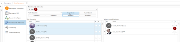 Hier werden links alle Mitarbeiter aufgeführt und rechts die, welcher der Kampagne schon zugeordnet sind. Mitarbeiter können einfach per Drag&Drop hinzufügt und/oder entfernt werden. Über den Filter (1) werden entsprechend der Auswahl alle Kunden durchsucht und die entsprechenden Mitarbeiter vorausgewählt, diese können dann gleichzeitig hinzufügt werden. Weiter besteht die Möglichkeit einem Mitarbeiter Rechte für Admin und alle Kunden sehen zugeben (2).
