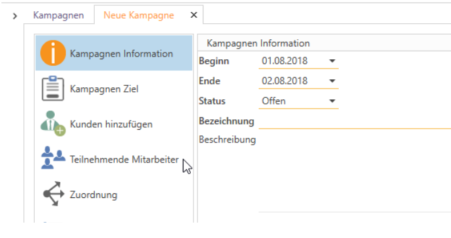 Hier werden das Start- und Enddatum, der Status, die Bezeichnung und die Beschreibung der Kampagne angegeben (wobei die Pflichtfelder orange unterstrichen sind). Der Status ist aktuell nur für die Suche relevant.