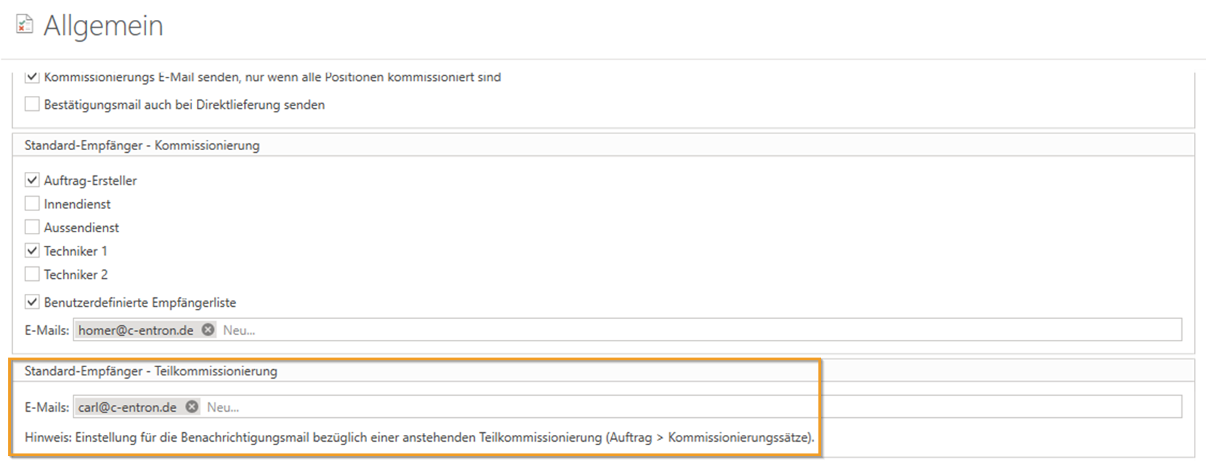 Ein Standardempfänger für diese Benachrichtigungen kann in den Einstellungen unter Logistik -> Allgemein festgelegt werden.