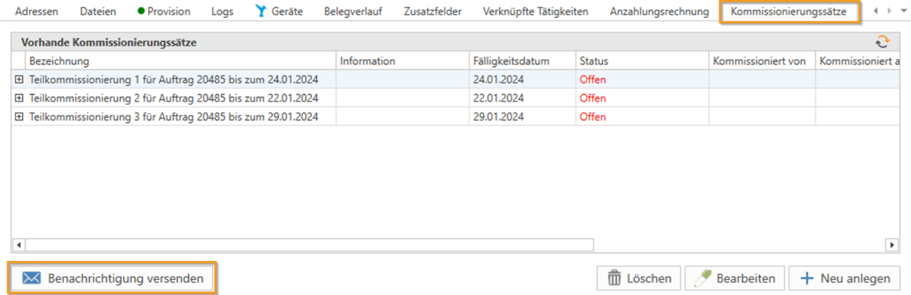- Im Tab „Teilkommissionierung“ eines Auftrags wurde ein neuer Button „Benachrichtigung versenden“ hinzugefügt. Über diesen Button kann eine Benachrichtigung, beispielsweise an einen Lagermitarbeiter, gesendet werden, die darüber informiert, welche Positionen nun kommissioniert werden sollen.