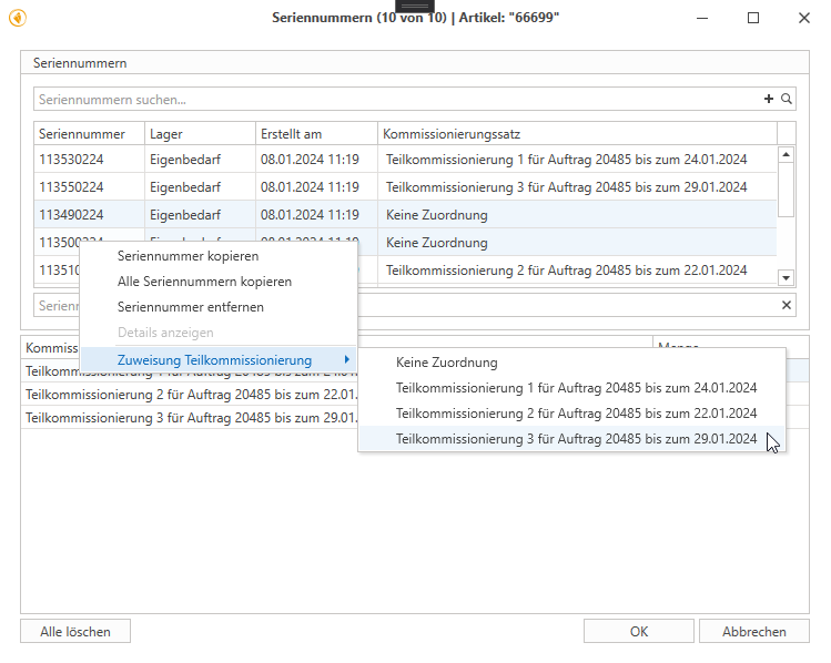 Die Zuweisung zur Teilkommissionierung erfolgt durch einen Doppelklick oder über das Rechtsklick-Menü. Nach der Zuweisung springt die Seriennummer in die obere Liste. Dort kann sie bei Bedarf wieder entfernt werden, was bedeutet, dass sie nur aus der Teilkommissionierung verschwindet, jedoch weiterhin für den Auftrag verfügbar bleibt.