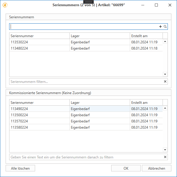 - Unten wird eine Liste der kommissionierten Seriennummern angezeigt.