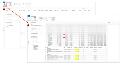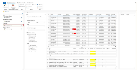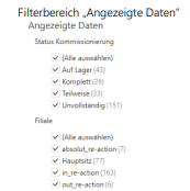 Nachdem die Daten geladen wurden, können diese entweder über die Tabelle oder durch den vorgefertigten Filterbereich „Angezeigte Daten“ weiter einschränkt werden und anhand der Zahlen in den Klammern ist zu erkennen, wie viele Aufträge dies betrifft.-> Diese werden direkt neu geladen.