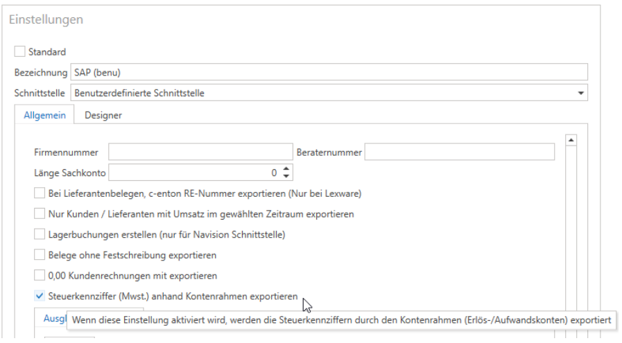 Bei den Einstellungen für die Buchhaltungsexport-Schnittstellen gibt es eine neue Checkbox „Steuerkennziffer (Mwst.) anhand Kontenrahmen exportieren“.