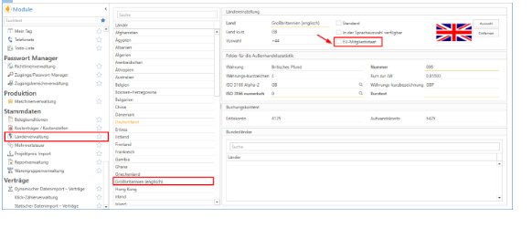 Daher sollten Sie in den Stammdaten im Modul „Ländereinstellungen“ im Land Großbritannien der Haken bei „EU-Mitgliedstaat“ entfernt werden.