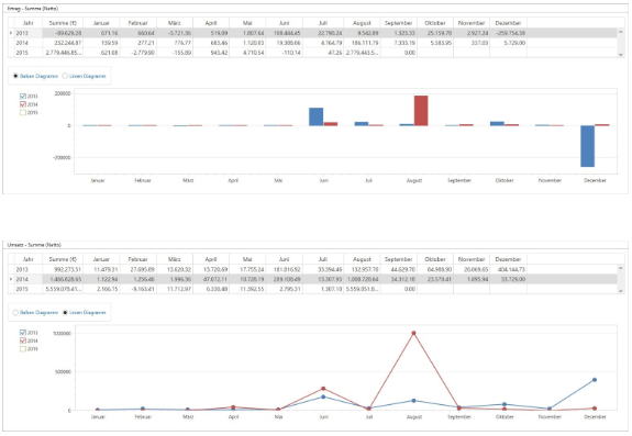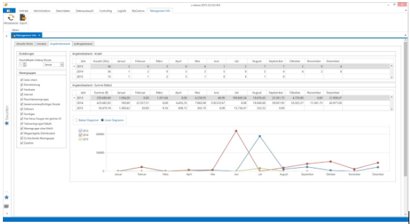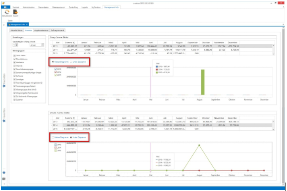 Es können nun in den Reitern „Umsätze“, „Angebotsbestand“ und „Auftragsbestand“ auch grafische Auswertungen in Form von Balken-Diagrammen erstellt werden und es ist möglich zwischen Linien- und Balken Diagrammen hin und her zu wechseln.