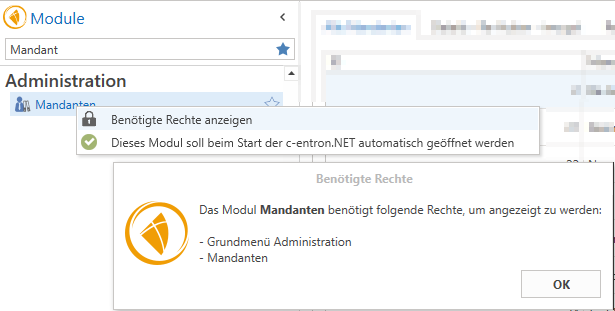 Das Modul Mandanten benötigt folgende Rechte, um angezeigt zu werden: