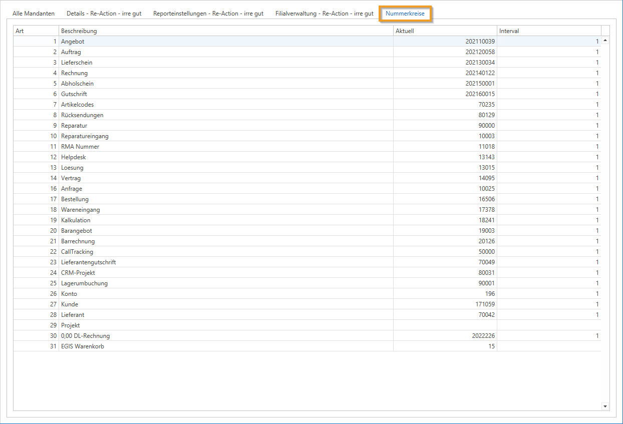 In der letzten Registerkarte „Nummerkreise“ legen Sie die Nummernkreise für Angebote, Bestellungen, Gutschriften, Rechnungen und Tickets fest.
