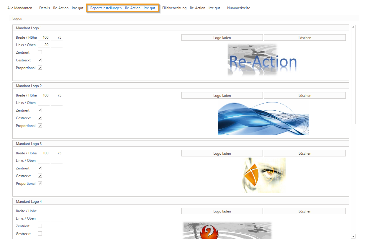 In der Registerkarte „Reporteinstellungen“ können Sie Ihr Firmenlogo in Originalgröße hinterlegen. Vergrößerungen oder Verkleinerungen sollten vermieden werden, um die Druckqualität zu gewährleisten. Zusätzliche Logos für Zertifizierungen oder Partnerschaften können ebenfalls hinzugefügt werden.