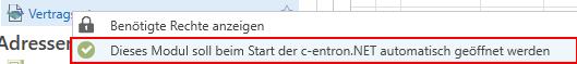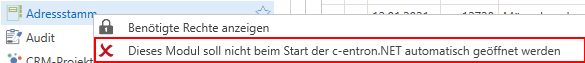 Das Entfernen des Autostarts funktioniert auf die gleiche Weise - Rechtsklick auf ein Modul in der Modul-Liste und „Dieses Modul soll nicht beim Start der c-entron.NET automatisch geöffnet werden“ wählen.