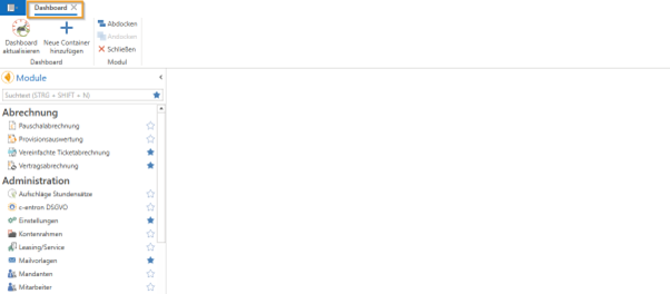Nach dem Öffnen erscheint standardmäßig das Dashboard-Modul. Wenn der Bereich leer zu sein scheint, ist er es nicht, was anhand des angezeigten Reiters im oberen Bereich zu sehen ist – es wurden einfach noch keine Container in das Dashboard gezogen.