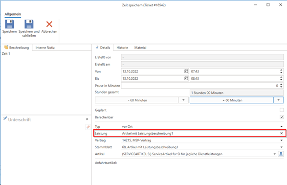 Wenn Sie nun auf ein Ticket mit einer Leistung eine Zeit erfassen, wird die „Leistung“ des Tickets automatisch in der Zeit hinterlegt.