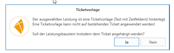 Ist der ausgewählten Leistung eine „Ticketvorlage“ zugewiesen, kann diese jedoch nicht übernommen werden. In diesem Fall können Sie nur die Leistung hinzufügen oder dies nochmal „abbrechen“. Hierzu erscheint die Info darüber und die Frage, ob der Leistungsbaustein nun hinzugefügt werden soll oder nicht.