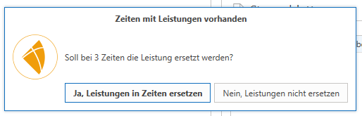 Wenn zum Zeitpunkt des Hinzufügens oder Entfernens einer Leistung des Tickets bereits Zeiten in diesem Ticket vorhanden sind, kann die Änderung der Ticket-Leistung für alle bestehende Zeiten übernommen werden. Hierzu erscheint eine Abfrage.