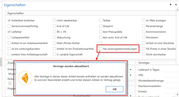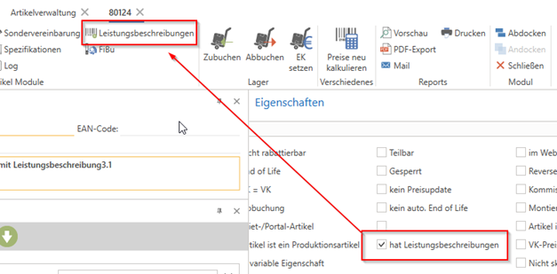 Nun können Sie die von Ihnen gewünschten Artikel anlegen bzw. bereits bestehende Artikel anpassen. Sie können hierbei bei dem jeweiligen Artikel in den „Eigenschaften“ den Haken bei „hat Leistungsbeschreibungen“ setzen.