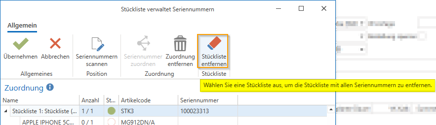 Sie können nun im Bereich „Zuordnung“ den Stücklistenkopf oder auch den jeweiligen Artikel markieren und über „Seriennummern scannen“ die Seriennummern dieses Artikels auswählen oder auch entfernen.