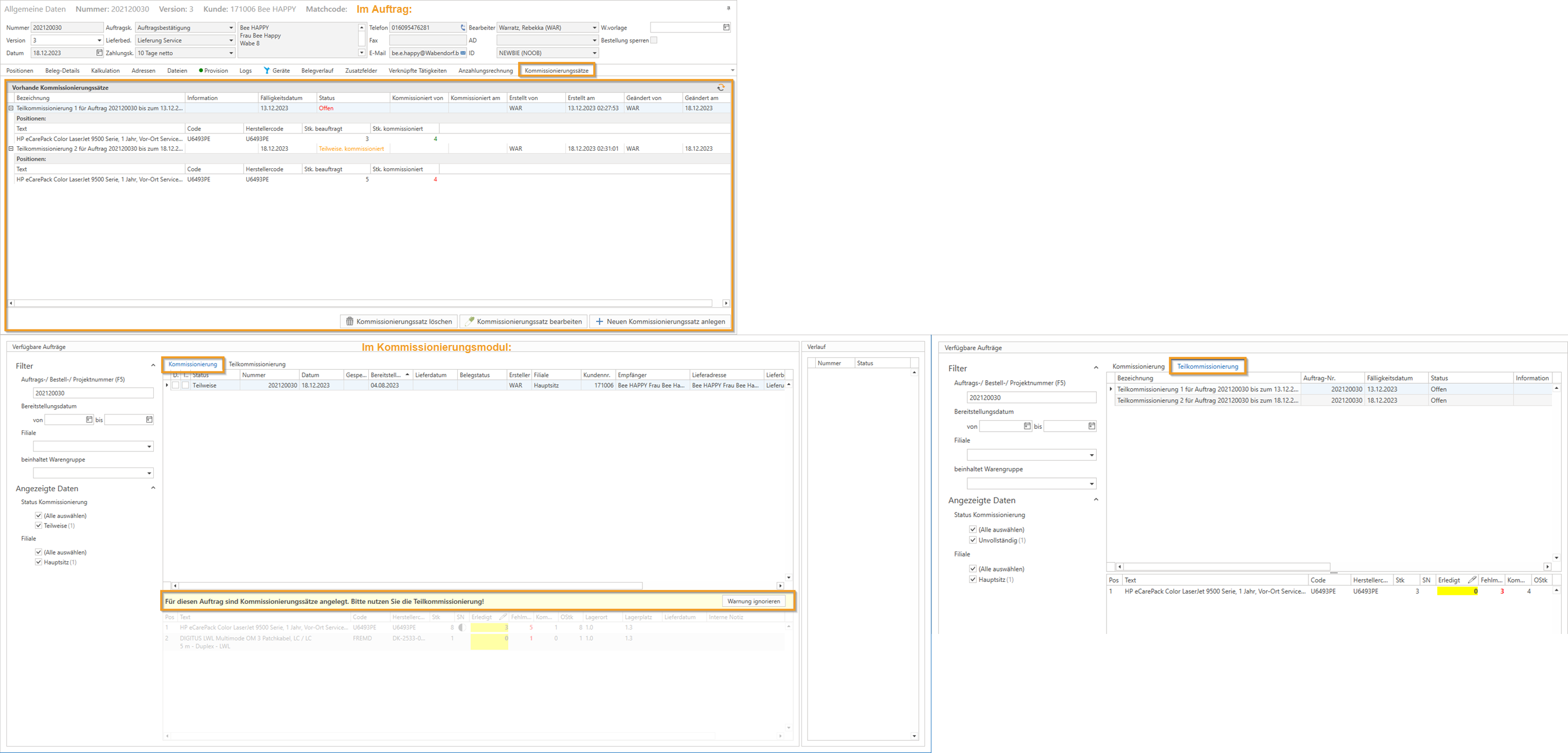 Das Kommissionierungsmodul wurde ebenfalls um einen neuen Tab für die Teilkommission erweitert. Hier erfolgt die Teilkommissionierung genau nach dem gleichen Ablauf wie bei einer normalen Kommissionierung. Der Unterschied besteht darin, dass im Hintergrund nur ein Teil des Auftrags kommissioniert wird.