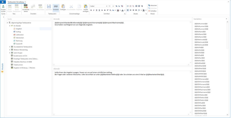 Mit den An-Abrede-Textbausteinen können Sie die Kunden-Belege (Angebot, Auftrag, Lieferschein, Abholschein, Rechnung und Gutschrift) personalisieren. Diese Textbausteine werden ober bzw. unterhalb der Positionen eingefügt. Hierzu können die rechts zu sehenden Variablen verwendet werden, die einfach per Drag&drop an die jeweilige Position gezogen werden können.