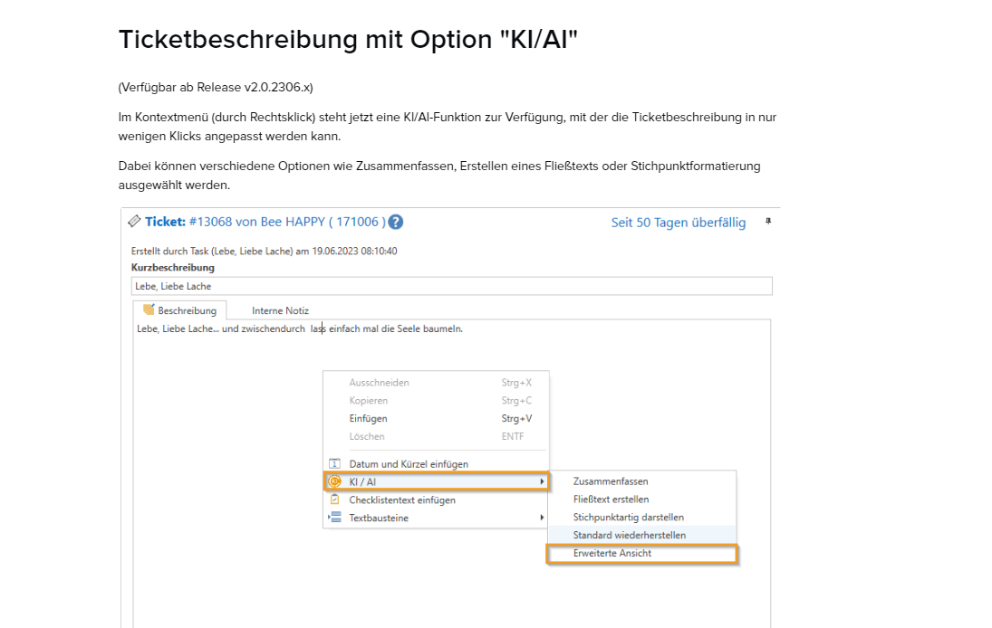 Ticketbeschreibung mit Option "KI/AI"