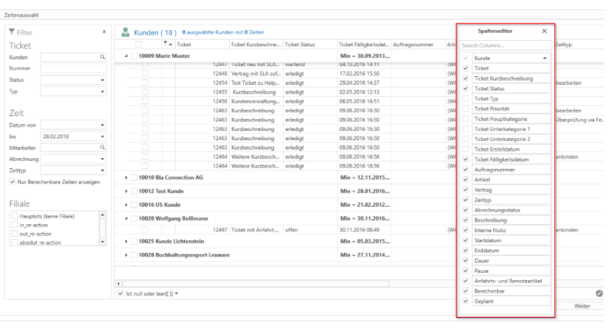 Wird ein Kunde geöffnet, sind dessen Zeiten zu sehen, wobei jede Zeile eine Zeit des Kunden darstellt. Die Auswahl und Reihenfolge der Spalten können Sie über den Spalteneditor (Rechtsklick auf einem Spaltenname -> Spalteneditor öffnen) steuern und dies auch in Ihrem persönlichen Profil speichern.