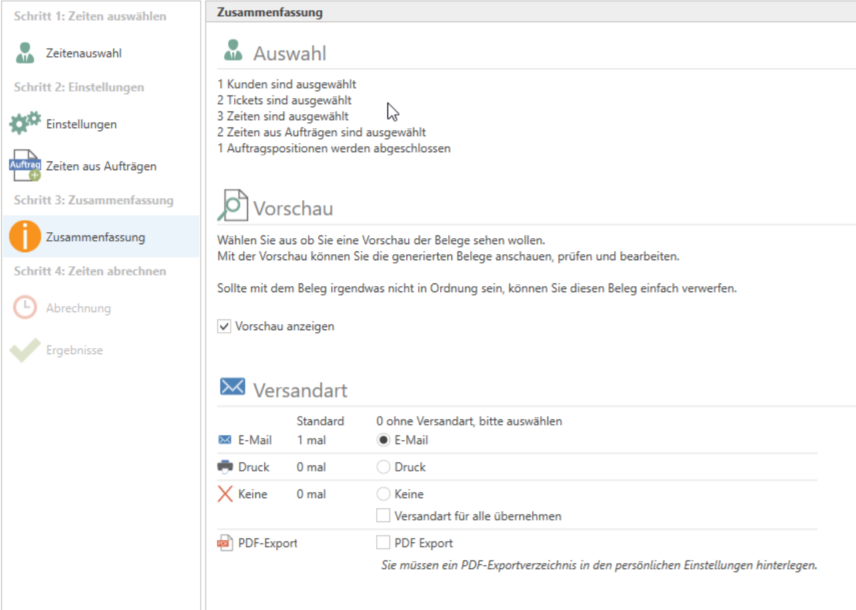 In der Zusammenfassung ist die getroffen Auswahl zu sehen und es besteht die Möglichkeit eine Vorschau in der Lieferschein-/Rechnungsansicht anzeigen zu lassen, was zwei Vorteile bietet: