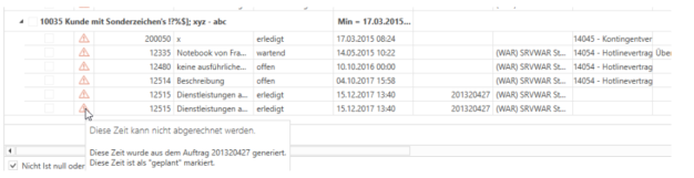 Sollte eine Zeit nicht abrechenbar sein, ist dies durch das Ausrufezeichen sichtbar. Wenn mit der Maustaste über das Zeichen gegangen wird, wird angezeigt, warum diese Zeit nicht abgerechnet werden kann (z.B. „ist geplant“, „hat keinen Artikel“, …).