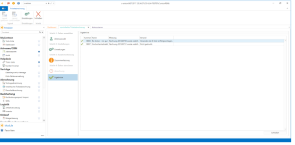 Am Ende ist eine Ergebnis-Übersicht zu sehen mit dem Status welche Rechnung erstellt wurde und ob der Versand/Druck funktioniert hat.