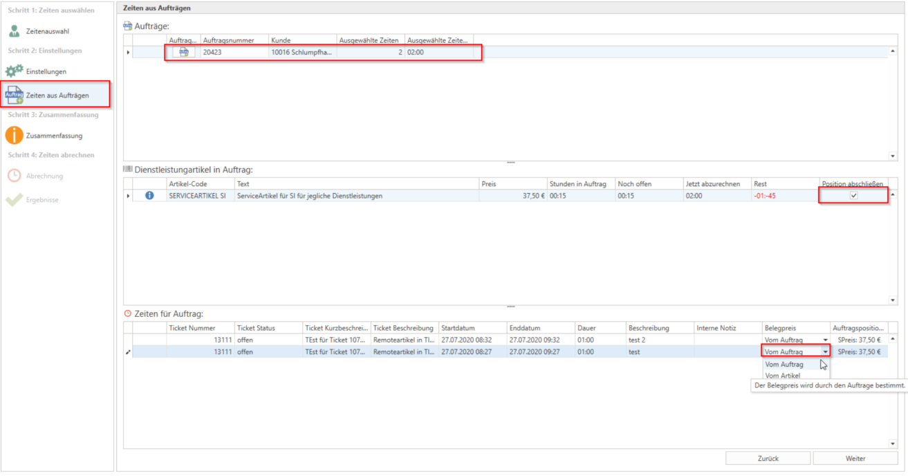 Wenn Sie Zeiten ausgewählt haben, die zu einem Ticket gehören, das mit einer Auftragsposition verknüpft ist (manuell oder durch „automatische Ticketerstellung aus Auftrag“), wird der Reiter „Zeiten aus Aufträgen“ sichtbar. Hier werden Ihnen nun zu den einzelnen Zeiten die dazugehörigen „Aufträge“ und darunter die verknüpften Auftragspositionen angezeigt. Sie können nun für die jeweilige Auftragsposition den Haken bei „Position abschließen“ setzen. Somit wird bei der Abrechnung der Zeit, diese Position „abgeschlossen“, also die Stückzahl auf „0 Stück“ geändert und der Auftrag ggf. auch gleich abgeschlossen, falls nun alle Positionen im Auftrag die Stückzahl „0“ haben.
