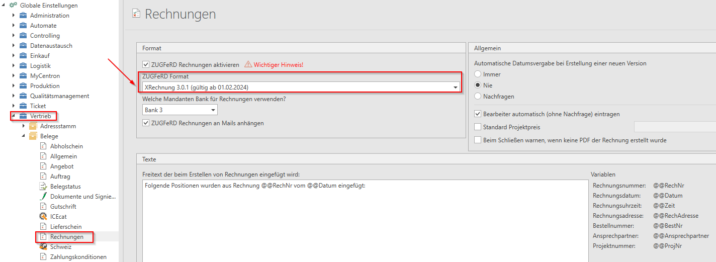 Die Einstellung „ZUgFeRD 3.0.1 (XRechnung)“ muss aktiviert sein.