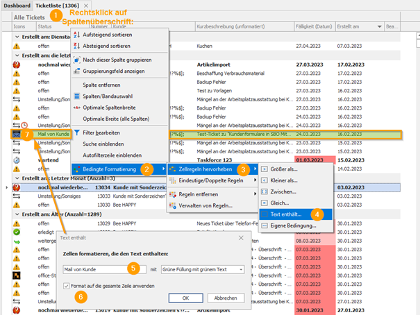 Dazu die Spaltenüberschrift per Rechtsklick anklicken(1) - Bedingte Formatierung (2) - Zellregeln hervorheben (3) - Text enthält (4) - hier den Namen des Stutus eintragen (5) - und die Formatierung wählen. Über die Checkbox kann bestimmt werden, ob dies für gesamte Zeile übernommen werden soll. (6)
