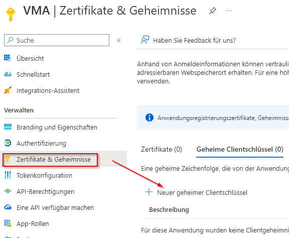 Der Key muss kopiert und für das Einfügen im VMA gespeichert werden. Nach Verlassen der Azure-Seite kann der Key nicht mehr eingesehen werden und muss neu erstellt werden.