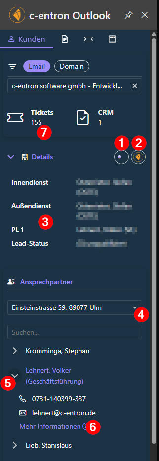 Im Bereich **Kunden** siehst du Details zum Absender der E-Mail. Wenn die E-Mail-Adresse einem Ansprechpartner zugeordnet werden kann, wird dieser angezeigt.