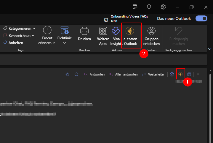 Da das Add-In auf dem Exchange installiert wird, steht es einzelnen oder allen Anwendern in deiner Firma zur Verfügung. du rufst es auf, indem du auf das kleine c-entron-Icon innerhalb der E-Mail oder in der Outlook-Menüleiste im Bereich **Add-Ins** klickst. Im „klassischen Outlook“ ist das Icon nur im Menüband oder verbirgt sich dort unter der Schaltfläche „Alle Apps“.