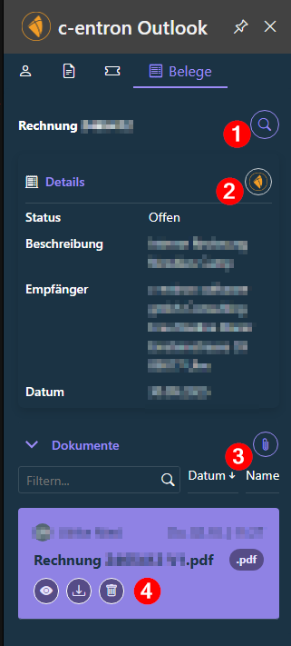 Klicke auf **Beleg in c-entron öffnen**, um den Beleg in c-entron zu öffnen.