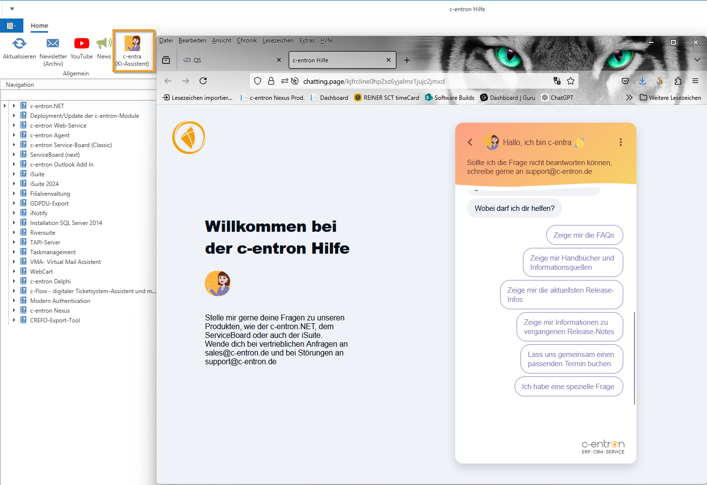 ·"c-entra" has been added to the c-entron help section, with a link to our chatbot "c-entra." Several topics are already provided here, and it is also possible to ask further questions under "I have a specific question." For more information, see centron help.