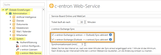NOTE: If you activate c-entron Exchange Sync, please deactivate Exchange Sync in the agent to avoid synchronization problems (applies to Graph; please restart the c-entron web service after making changes)