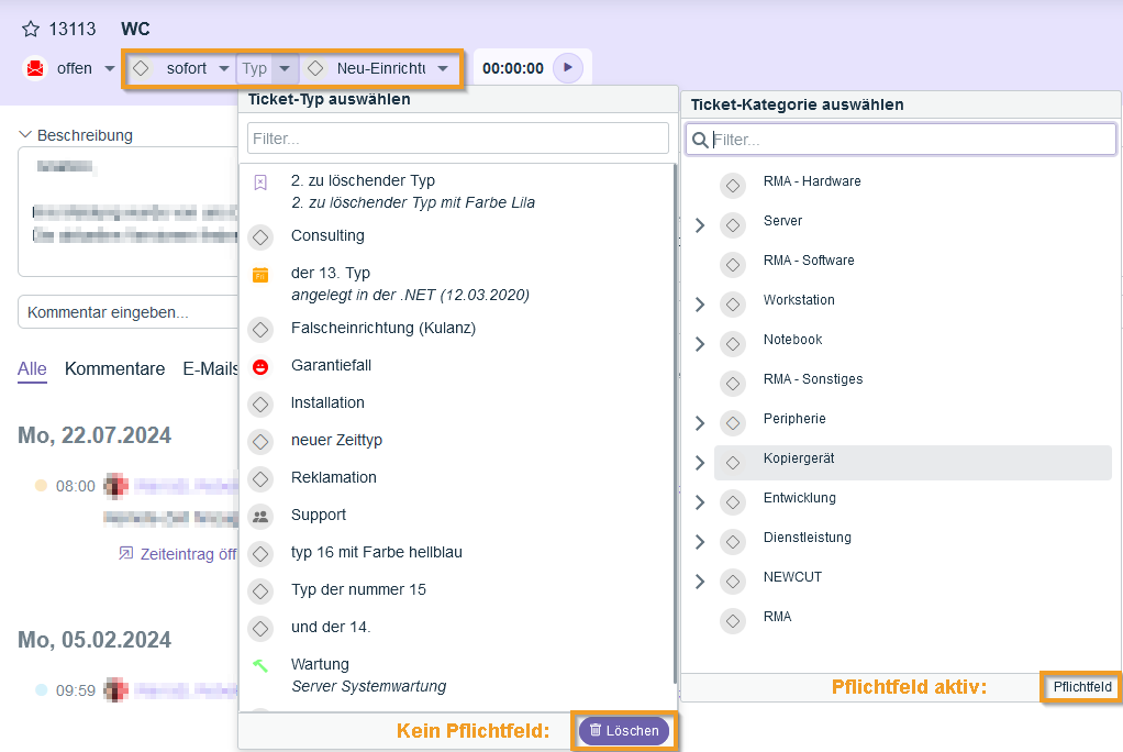 Type, category, and priority can now be deleted directly via the selection in the ticket header, provided these fields are not marked as mandatory. If a field is defined as mandatory, the note "Mandatory field" is displayed and deletion is not possible.