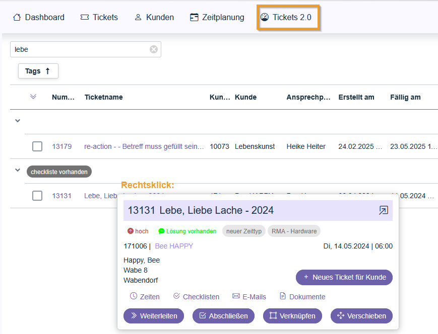 In Ticket List 2.0, the context menu (right-click on ticket) has been replaced. It now offers the same functions as the context menu in the old ticket list.