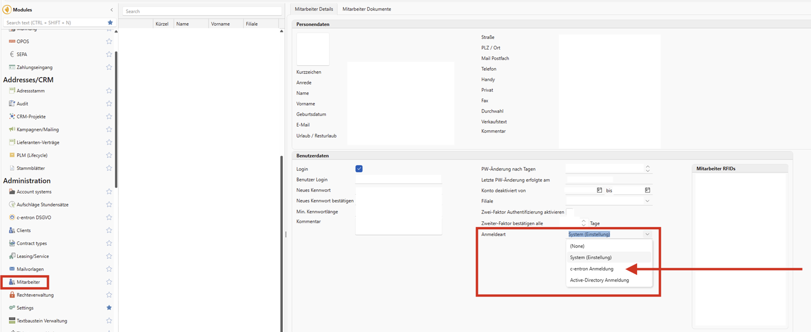 There is an option in the user settings to enable a fallback method for individual users. If this option is enabled for a specific user, Active Directory authentication is attempted first (as a mandatory setting). If the Active Directory login fails, a fallback attempt is made to log in the user with basic authentication, using the login credentials originally provided. The fallback can be configured on the employee page in c-entron ERP. Selecting the login type drop-down menu on c-entron login activates the fallback. All other options disable the fallback and have no further effect (they will be removed in a future update).