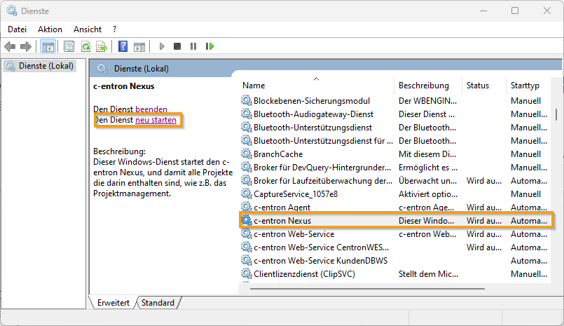 If necessary, restart the c-entron Nexus service in the local services.