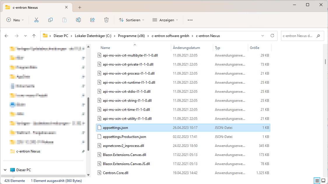 If saving to this location is not possible, save the file to another location. You can now replace the "appsettings.json" file in the c-entron Nexus directory with the newly created file.
